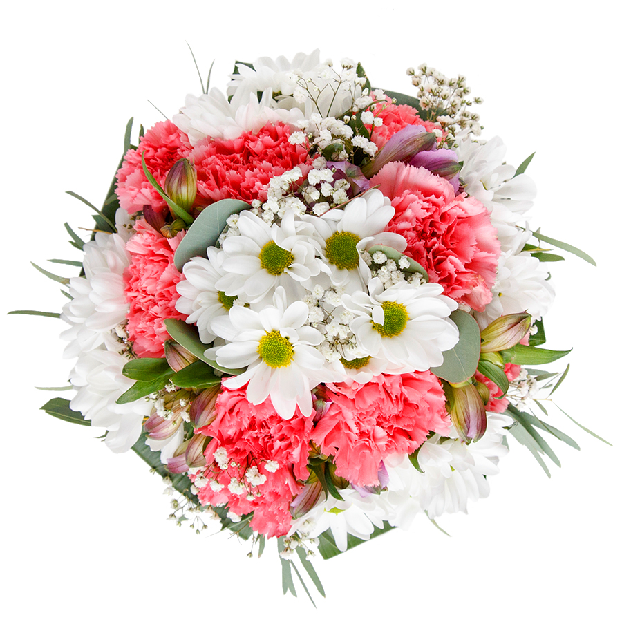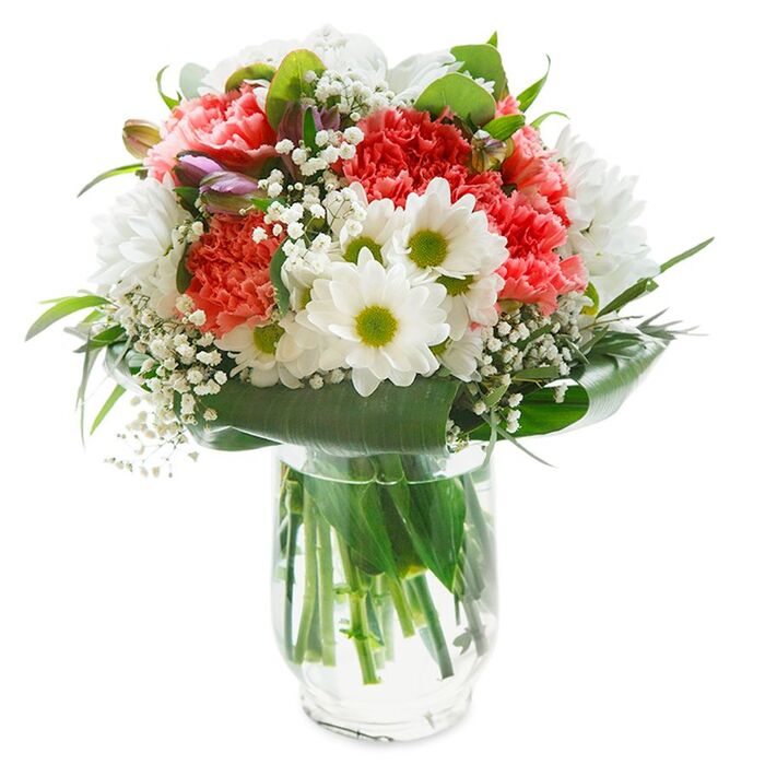 Brighten someone's day with our beautiful and unique flower arrangement. This charming bouquet combines elegant snow-white chrysanthemums, soft gypsophila, and lovely light pink carnations, all intertwined with graceful aspidistra leaves.
